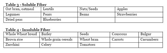 Fiber can be categorized into soluble and insoluble. These differences can explain their effect on health. Soluble fiber (Table 3) partially dissolves in water, forming a gel-like material. This type of fiber has been shown to help reduce cholesterol.[3] Insoluble fiber (Table 4) does not dissolve in water and promotes the movement of food through the gut.[2]